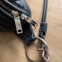 Marimekko Aava-laukku, mustaa nahkaa. Nahka pehmentynyt ja osin kulumaa, mutta ehjä ja kaunis laukku.