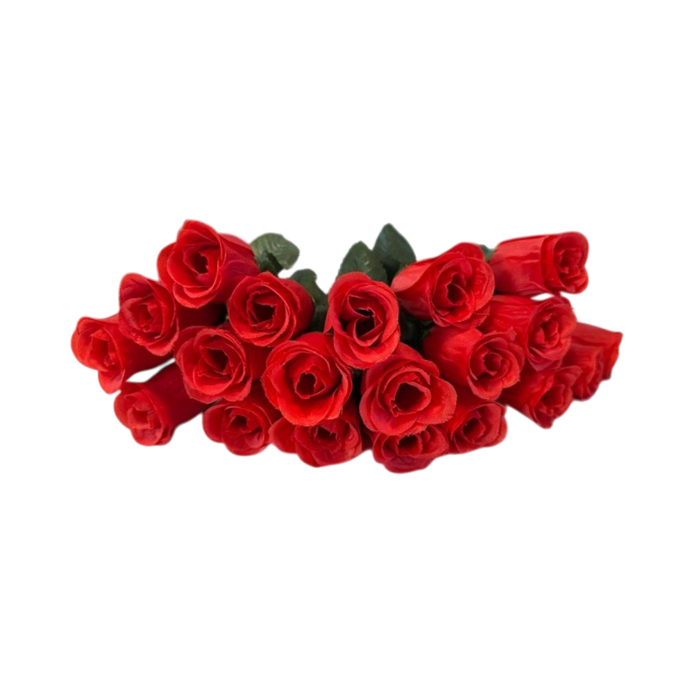Bundle of realistic red faux roses, decorative floral arrangement.