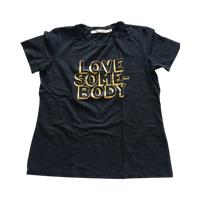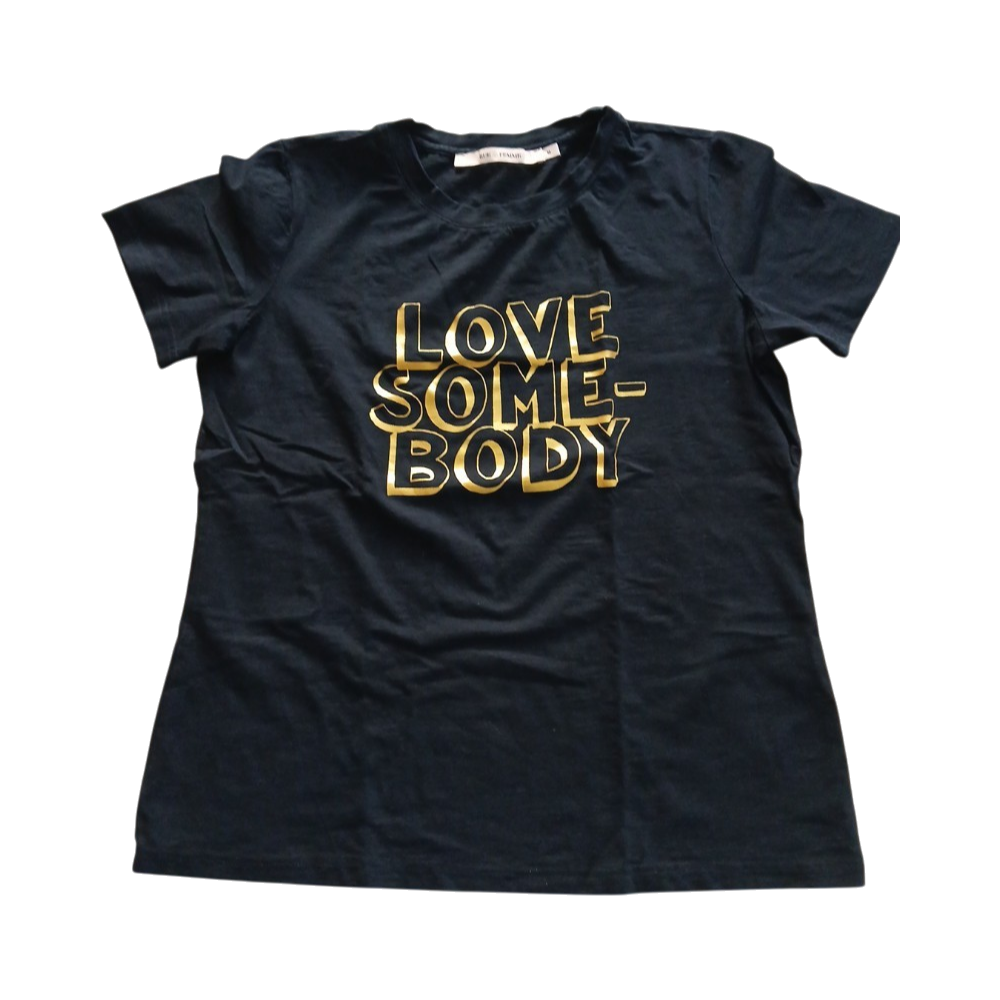 Musta t-paita kultaisin kirjaimin 'LOVE SOMEBODY'. Koko M. Merkki RUEdeFEMME. Ehjä, puhdas, väri musta. Ei kulunut, ei haalistunut. Minun koko on S. Eli minulle iso.
