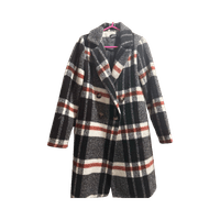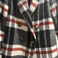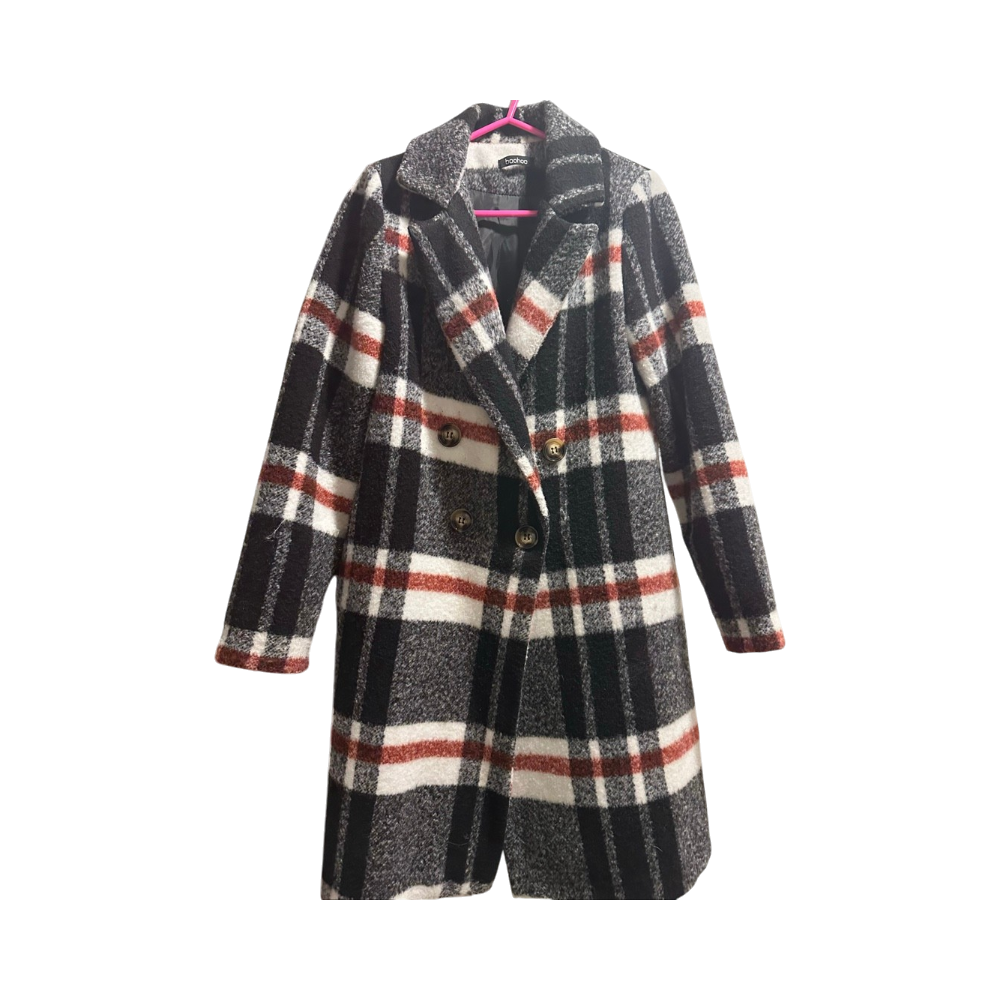 Pitkä kaksirivinen ruututakki, lämmin ja nukkaisuutta jonkin verran.