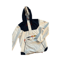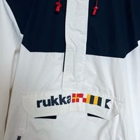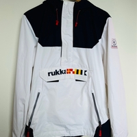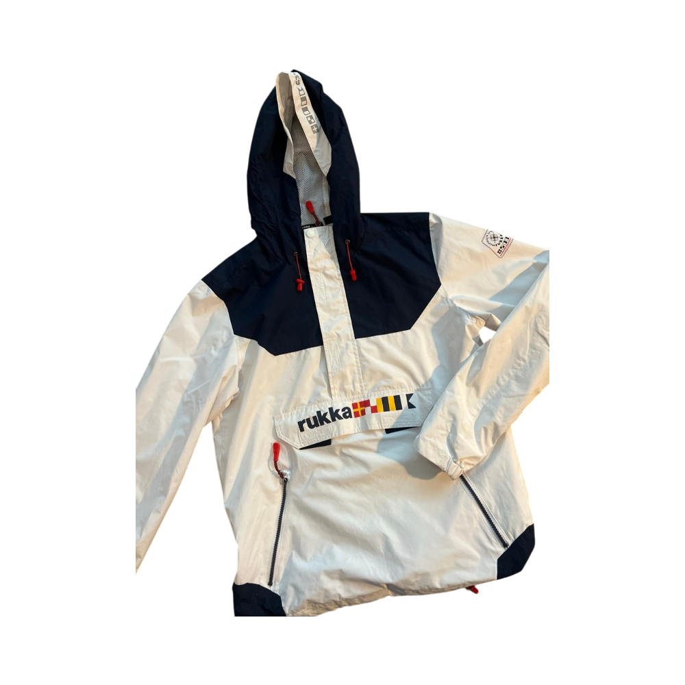 Rukan siistikuntoinen anorakki, veden- ja tuulenpitävä. Miesten malli, mutta toimii hyvin unisex mallina. Koko s, pituus 70cm ja kai kai mitta noin 55cm.