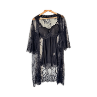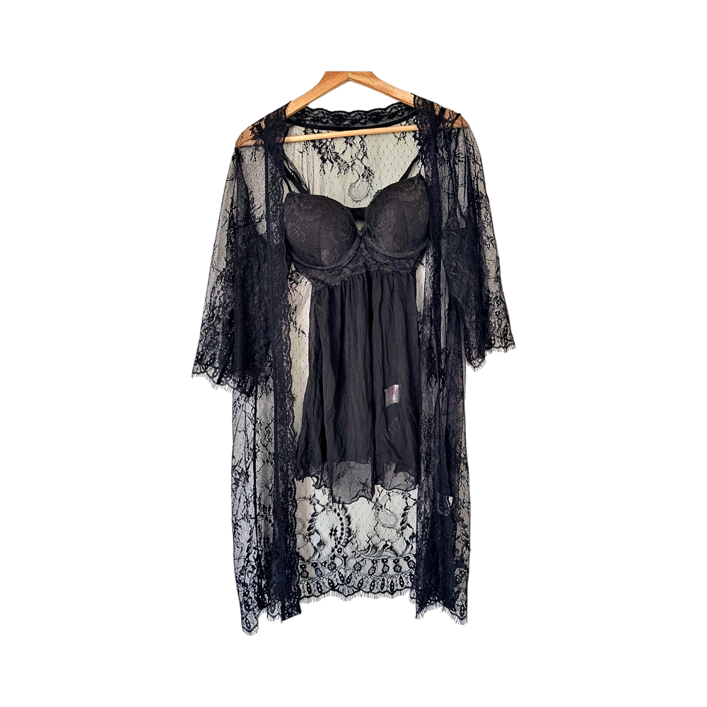 Sheer black lace lingerie with bra and robe set, elegant design.