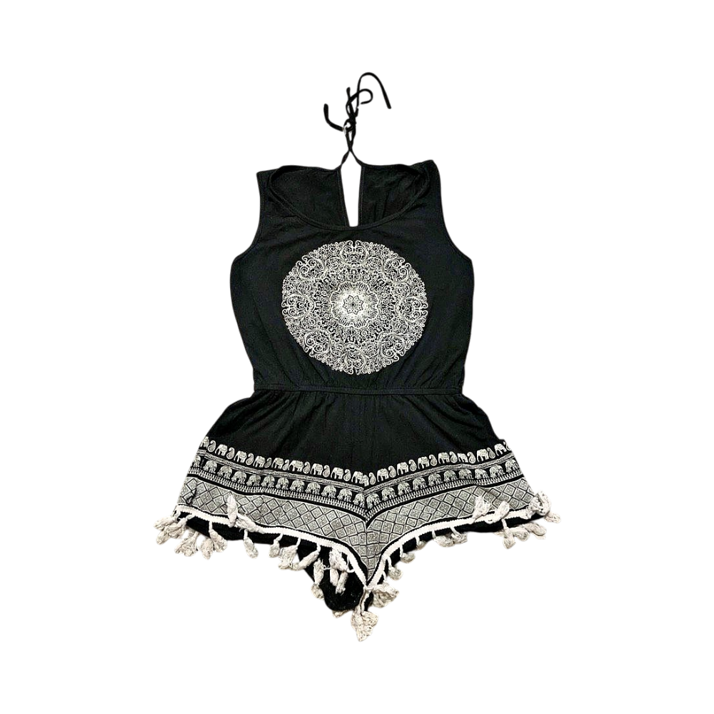 Naisten musta haalari valkoisilla kuvioilla ja hapsuilla, koko S—pieni m.