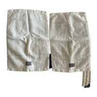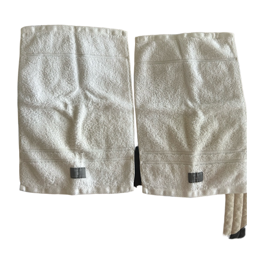 Valkoiset käsipyyhkeet 30x50. Hiukan tummentumaa ja toisessa reunasta purkaantunut joka helppo korjata
