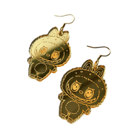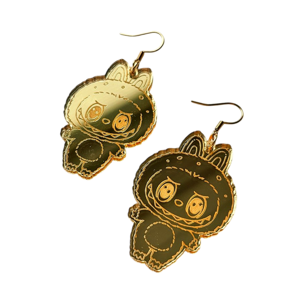 Kultaiset peilipintaiset akryylikorvakorut söpöllä hahmolla.