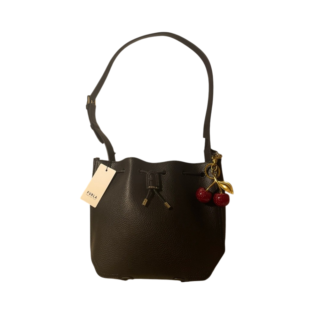 Uusi Furla Atena Keria bucket bag, väri musta. Kuvassa näkyvä kirsikkariipus 🍒 sisältyy mukaan, käyttämätön ja uusi. Voin jättää sen pois, jos et halua sitä.