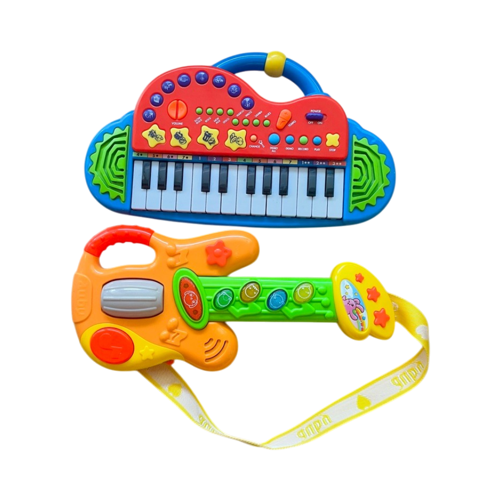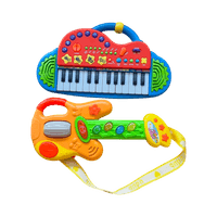 Bright plastic musical toys for toddlers, battery-powered. Children's electronic keyboard and guitar (without batteries).