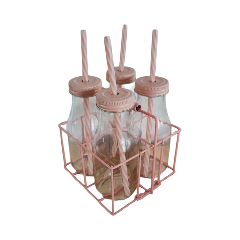 Neljä lasipulloa kannella ja pillillä metallitelineessä.