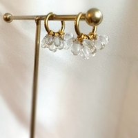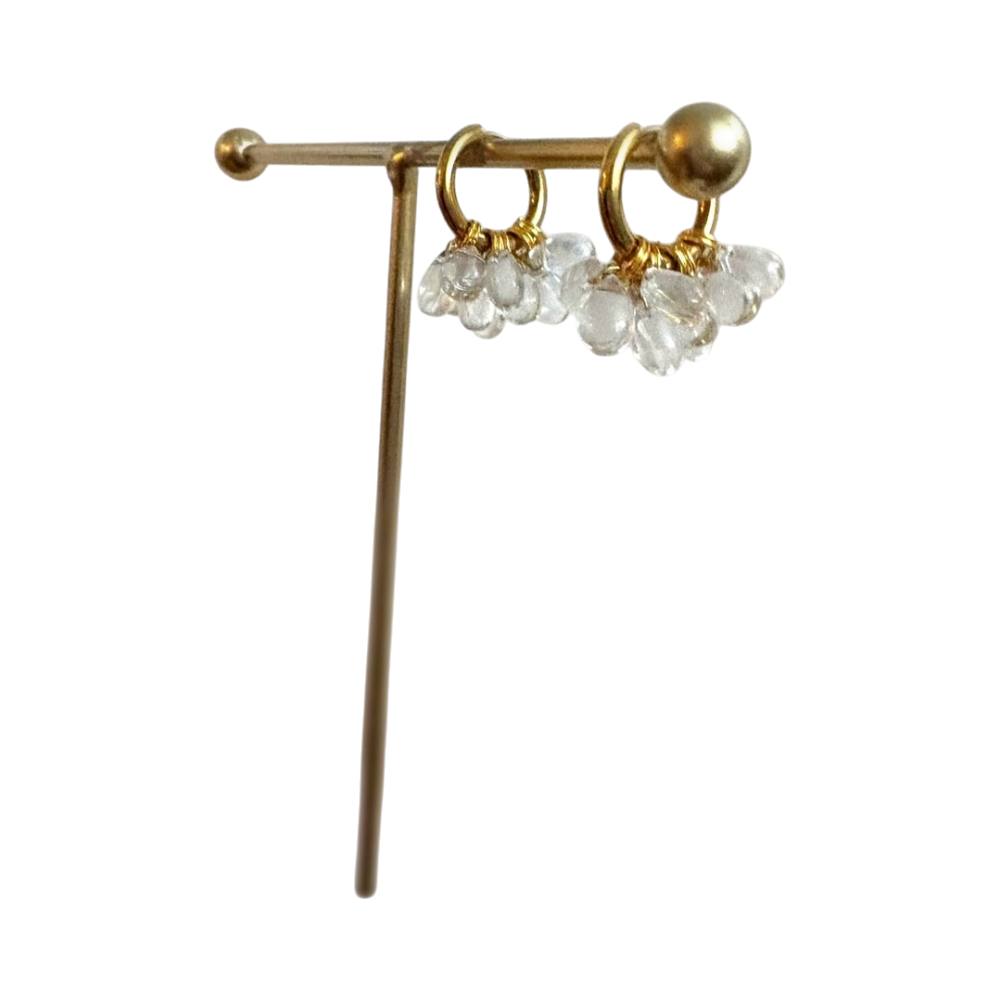 Kirkkaat läpinäkyvät lasipisara-korvakorut, allergisoimaton kullanvärinen rengas.