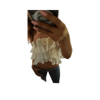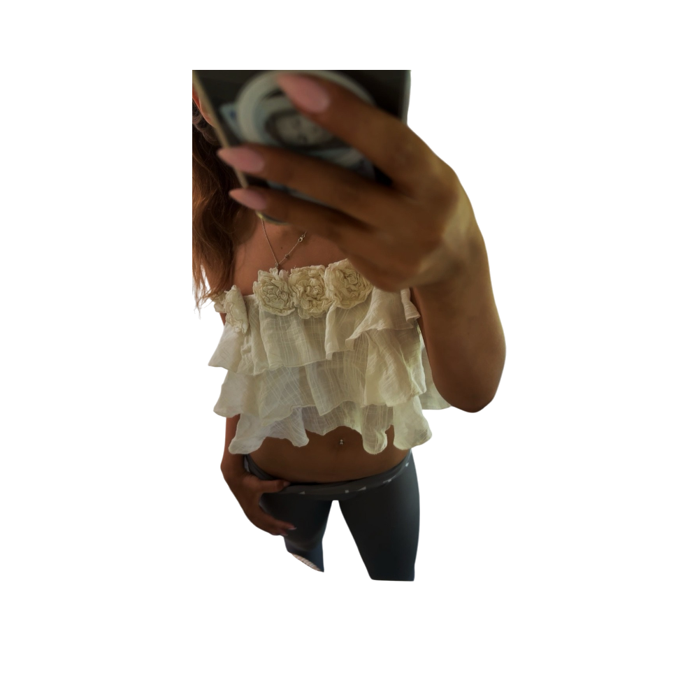 Lyhyt olkaimeton röyhelötoppi kukkakoristein zarasta. Uusi hintalapun kanssa
