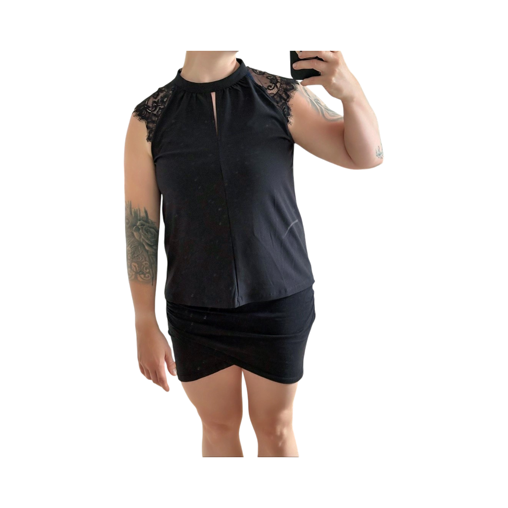 Musta sifonkitoppi pitsisomisteilla, elegantti ja siisti. Rinnassa ihan pieni nirhauma, muuten uusi ja käyttämätön