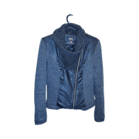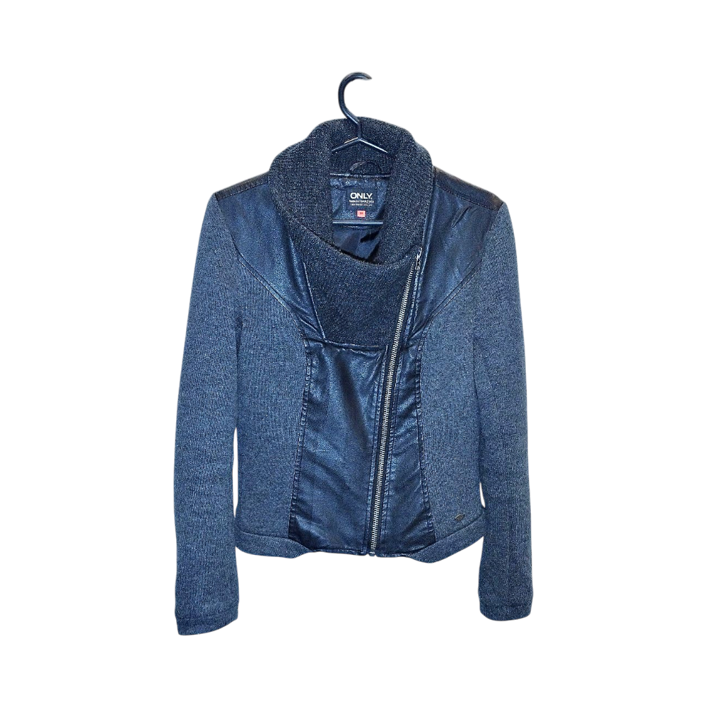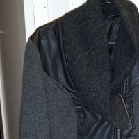 Tyylikäs tummanharmaa takki, jossa neulosta ja keinonahkaa.