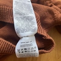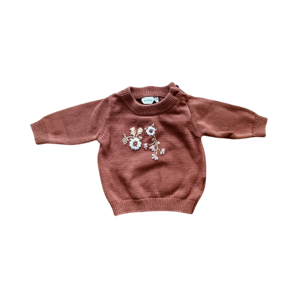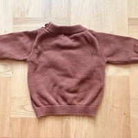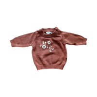 Pehmeä, ruskea vauvan neule kukka‑brodeerauksella. Sävy ennemmin terrakotta. Pinnassa vähän nukkaa, muuten erinomaisessa kunnossa.