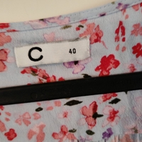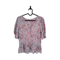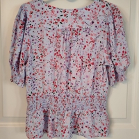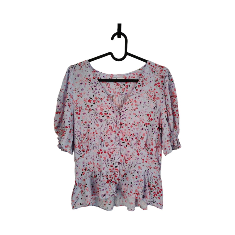 Kevyt kukkakuvioitu napillinen pusero, röyhelöhelma ja smokkivyötärö.