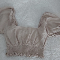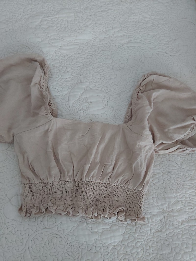 Beige lyhyt pusero röyhelöillä ja pussihihoilla. Selästä venyvä.