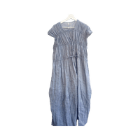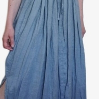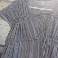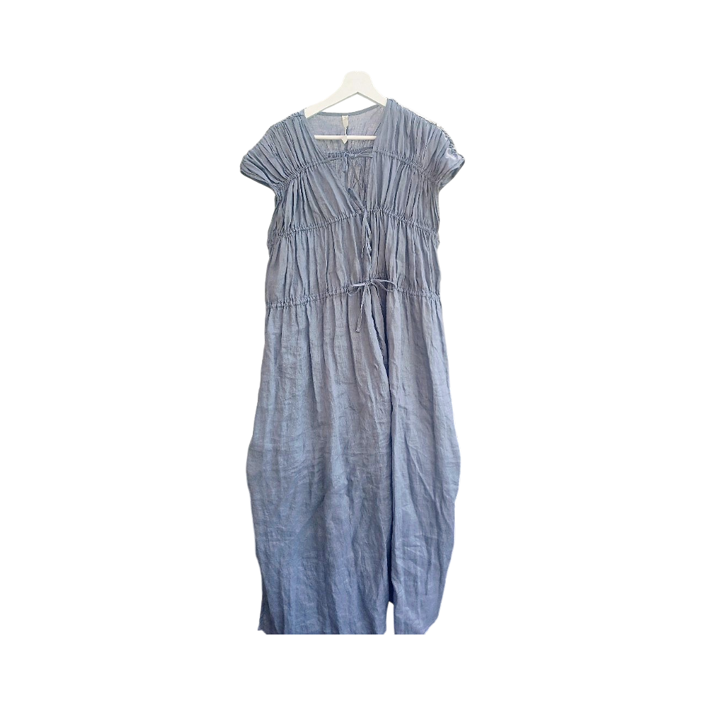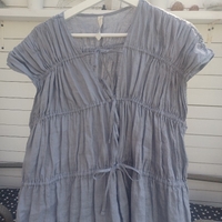 Kevyt ja ilmava vaaleansininen/ siniharmaa kesämekko, solmittavat nauhat. 100% pellavaa. Kokoa M mutta menee myös hyvin minulle joka olen kokoa L. Todella väljä mitoitus. Naruilla saa säädettyä istuvammaksi vyötärösta ja rinnasta. Ihanan pehmeää pellavaa.