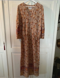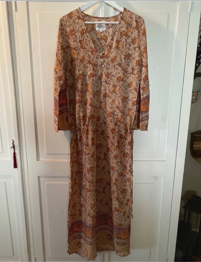 Kaunis boho henkinen mekko. Kiristys nauha lantion kohdalla, pitkät halkiot sivuissa ja leveät hihan suut.