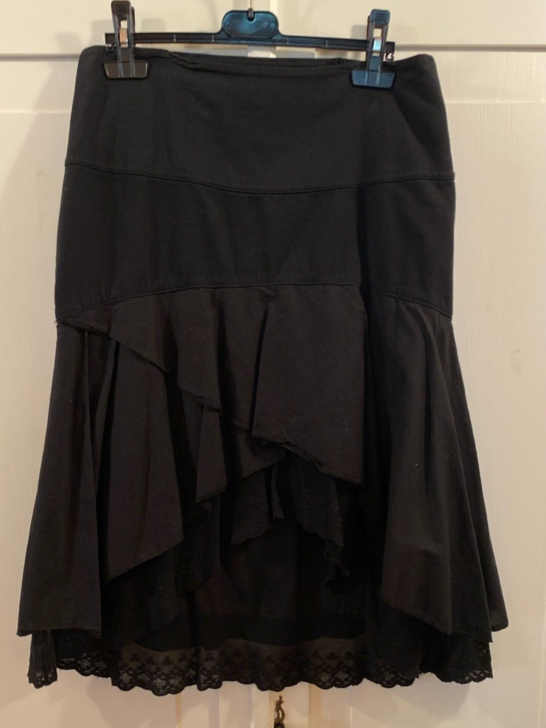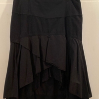 Musta kerros hame. Olen kaventanut hametta vyötärön kohdalta. Vetoketju sivulla.
