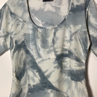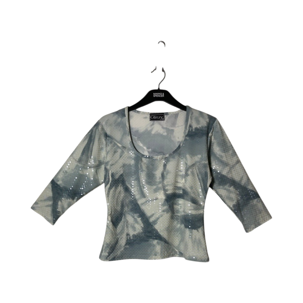 Kimaltavia, kellertäviä paljetteja koko kankaassa.