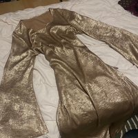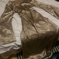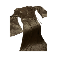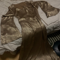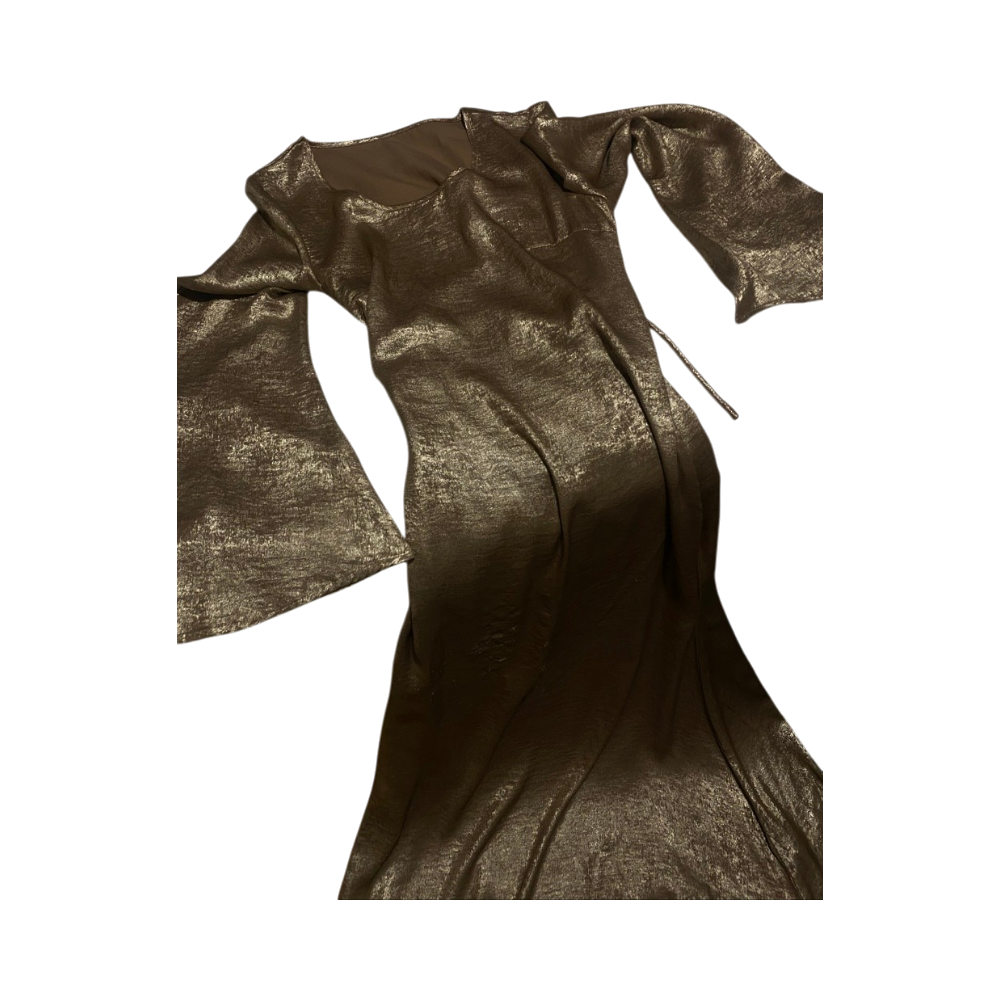 Pitkä juhlamekko kellohihalla, kiiltävä metallinhohto.