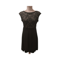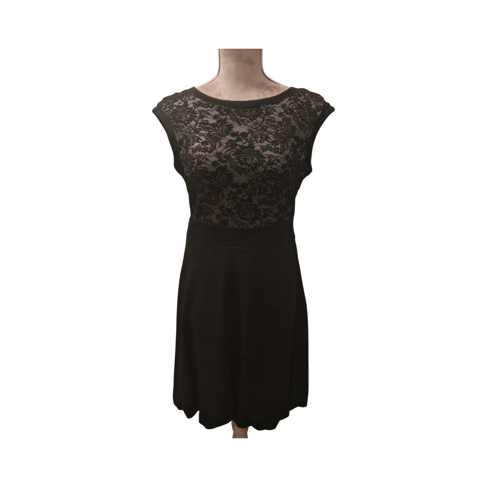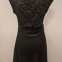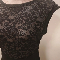 Kaunis musta mekko jossa pitsinen yläosa. Helmassa sileä vuorikangas. Merkki Tatuum.