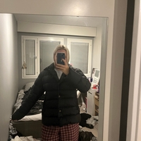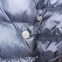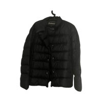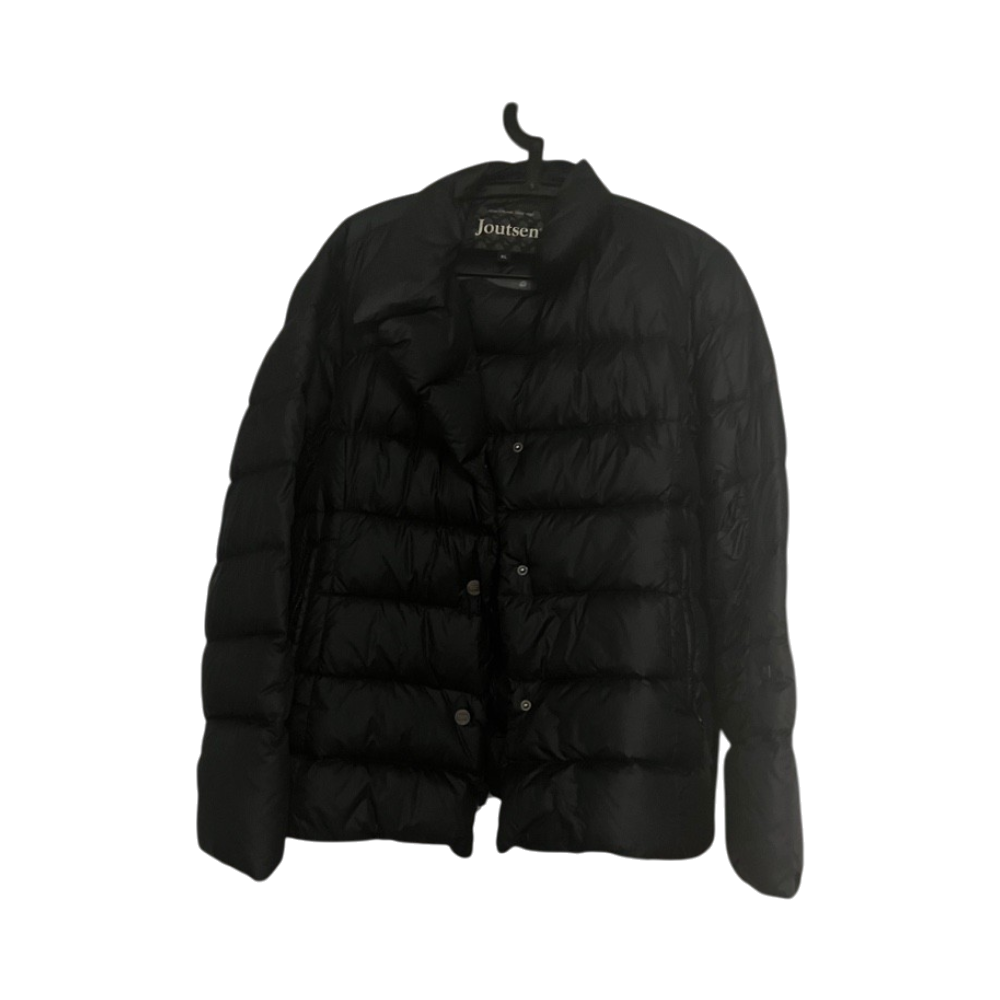 Black lightweight down puffer jacket, button and zip closure.