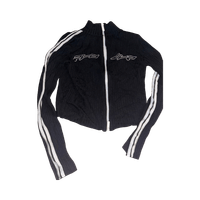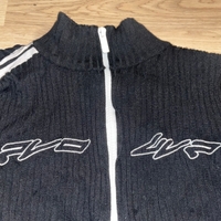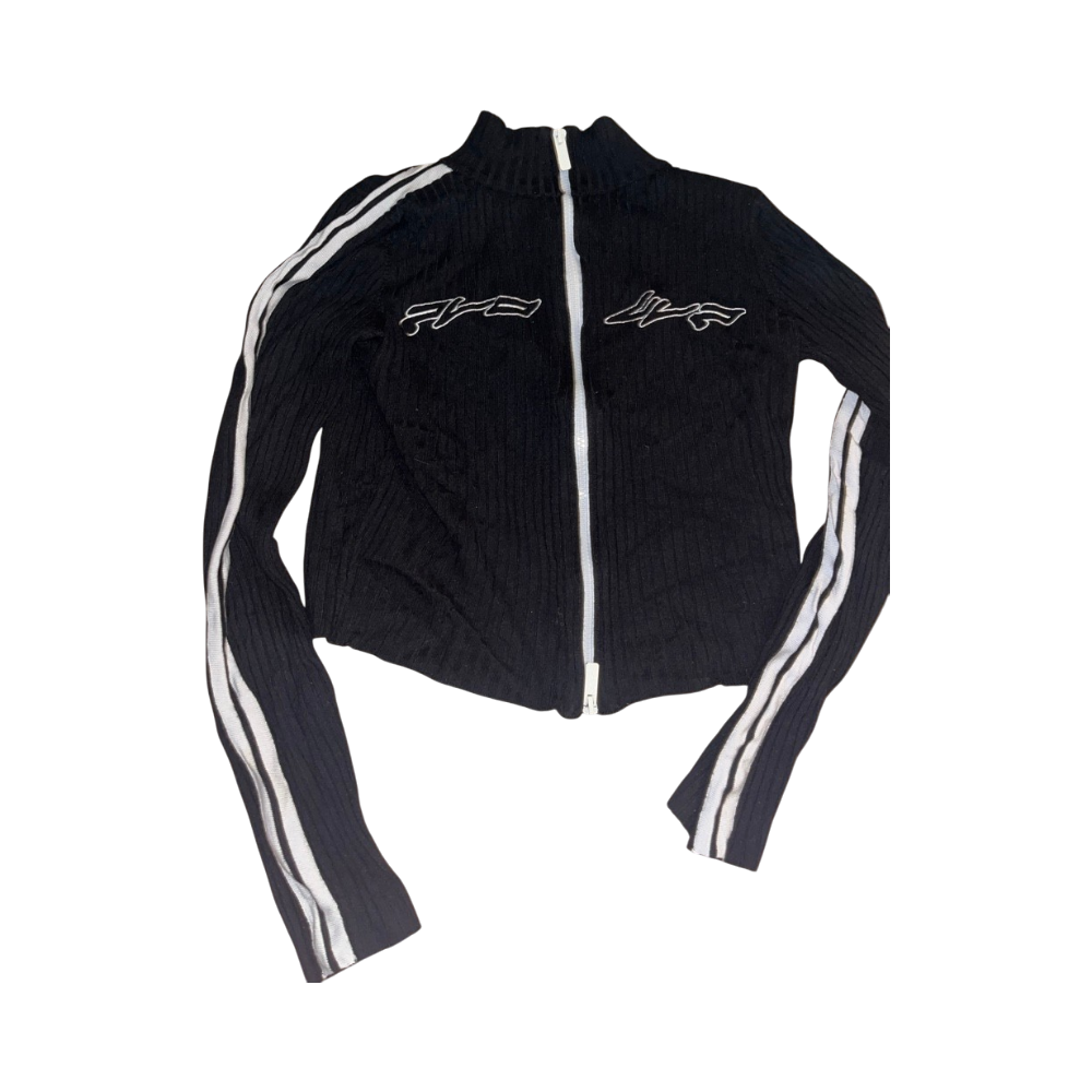 Lyhyt vetoketjullinen ribbineuletakki, valkoiset raidat hihoissa.