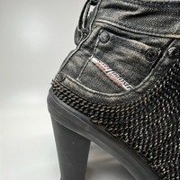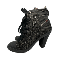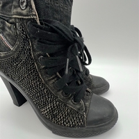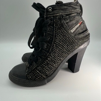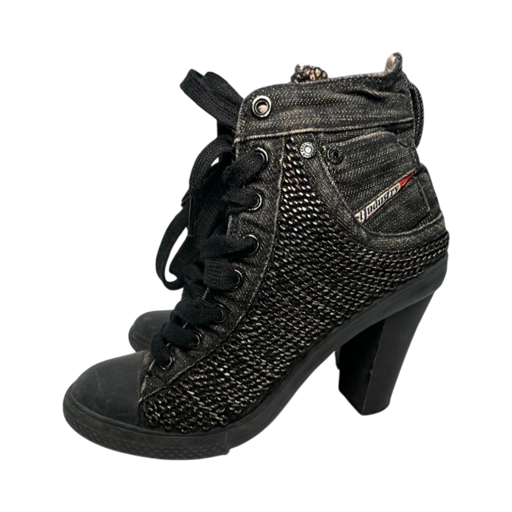 Farkkukankaiset mustat/harmaat korkeakorkoiset nauhalliset tennarit, joissa metalliset ketjukoristeet sivuilla. Korkolaput kaipaa vaihtoa.