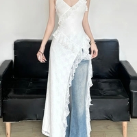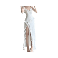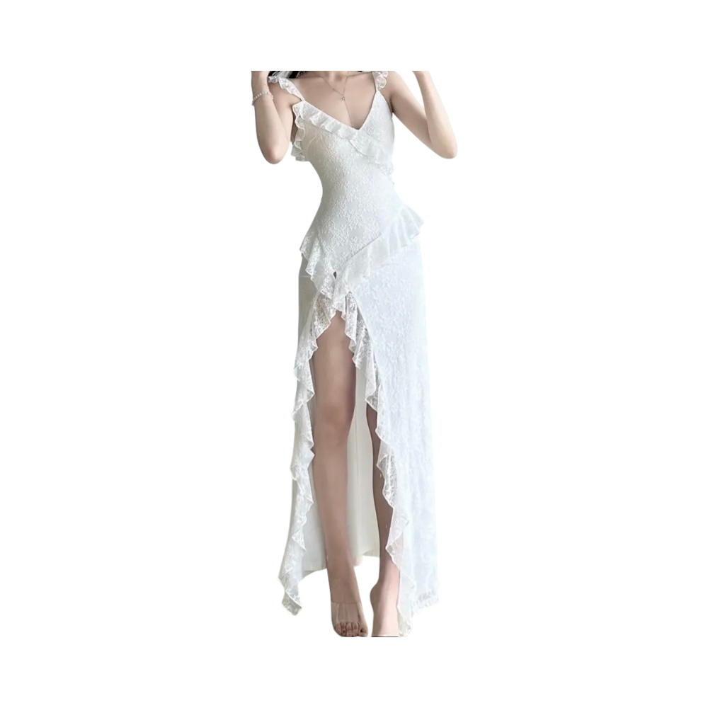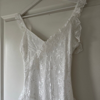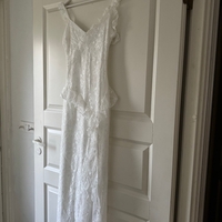 Pitkä valkoinen pitsimekko röyhelöyksityiskohdilla. Koko S