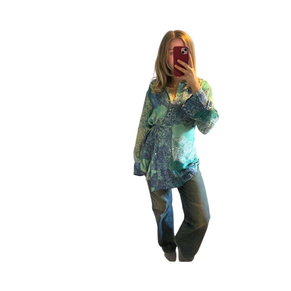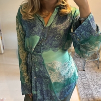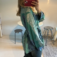 Massimo Dutin pusero koossa 40. Puseron saa sivulta solmittua haluamallaan tavalla. Itse olen kokoa S ja oversized.