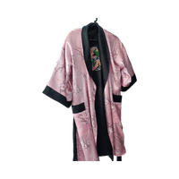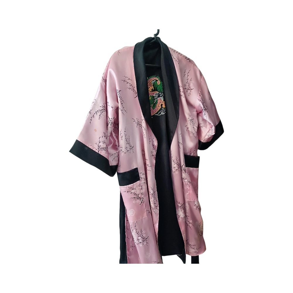 Vaaleanpunainen kimono mustilla yksityiskohdilla ja kirjailulla. Käännettävä aamutakki. Kokolappu on leikattu pois mutta noin M/L. Sopiva minulle joka olen kokoa L. Ihanan pehmeä satiininen materiaali kesään!
