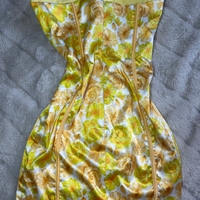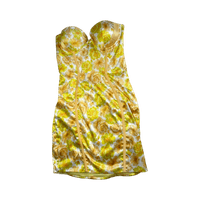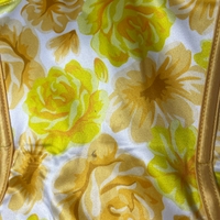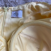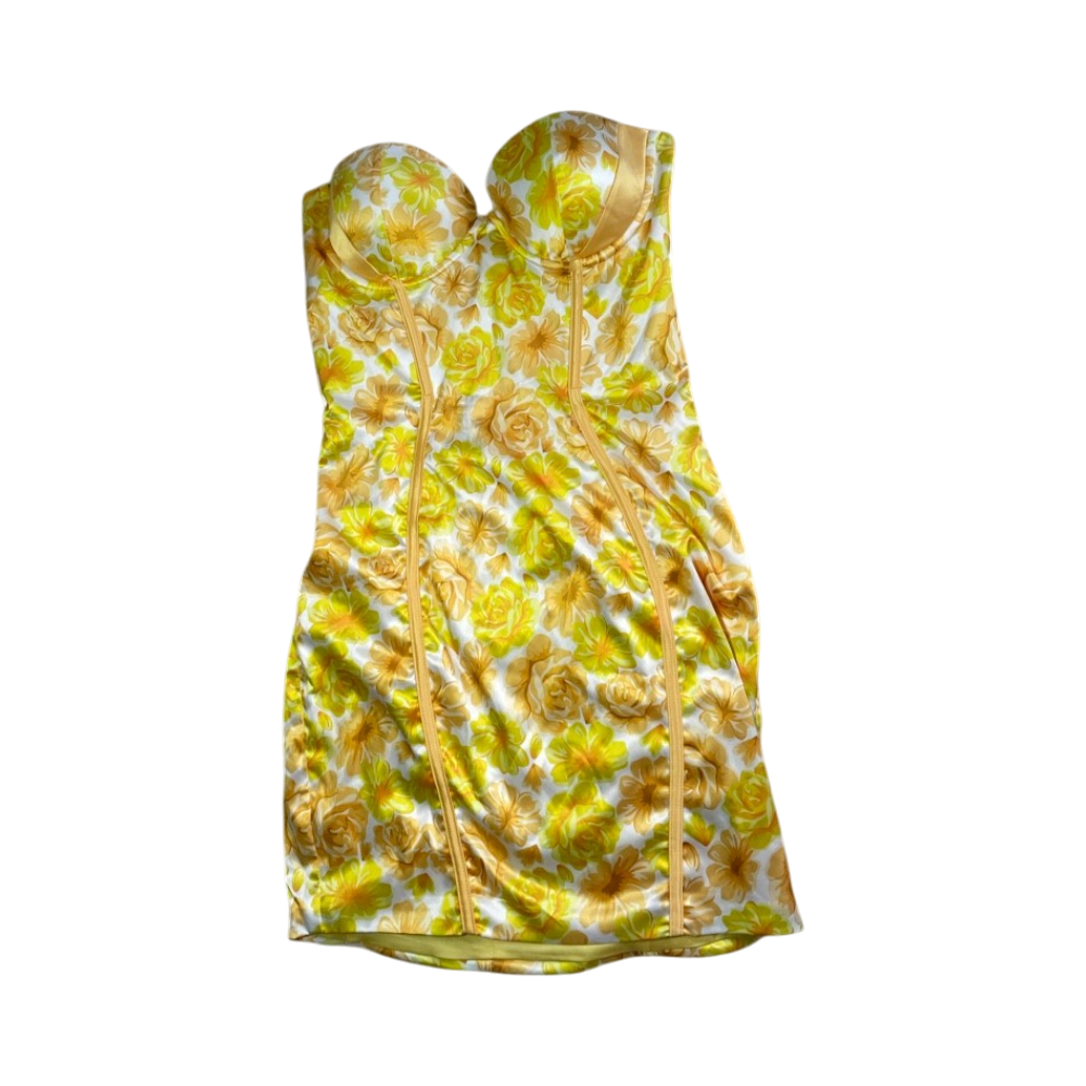 Pieniä virheitä kuten kupissa olevat tahrat ja pieni purkauma edessä(ei näy käytössä) olkaimeton, keltainen kukkakuosi, pehmustetut kupit.