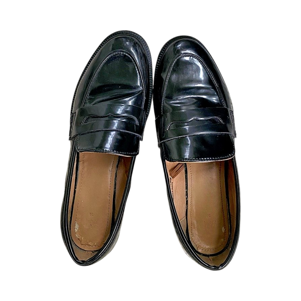 Mustat kiiltävät naisten loaferit. Vasemmassa kengässä kuvan mukaista kulumaa. H&M, koko 38.