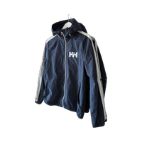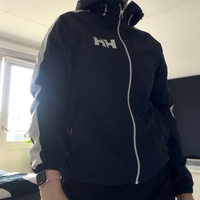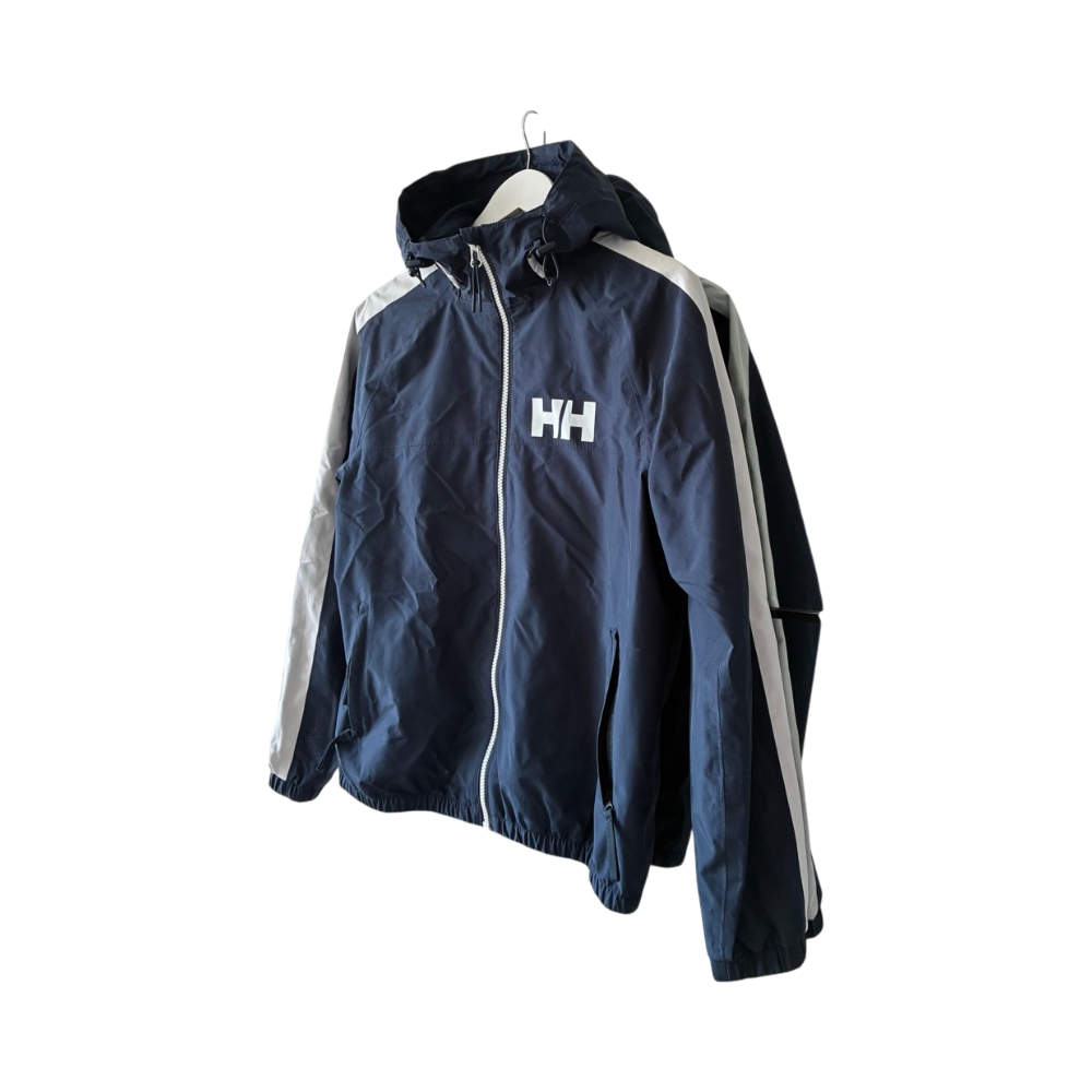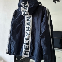 Kevyt, vetoketjullinen Helly Hansen -tuulitakki hupulla.
