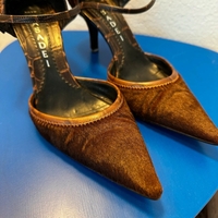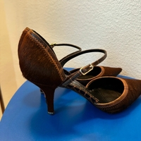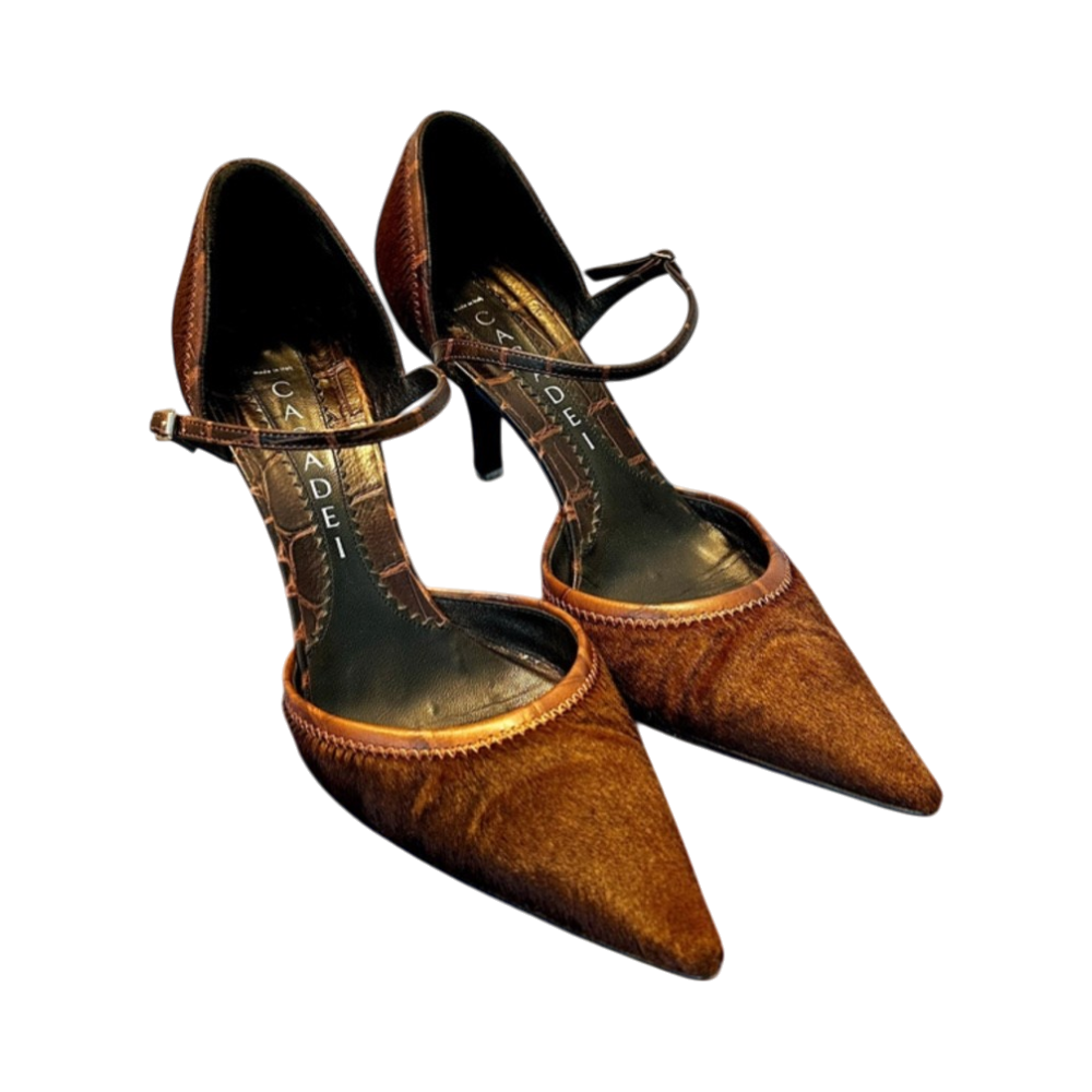 Ruskeat pony-hair tyyliset karvapintaiset teräväkärkiset korkokengät. Merkki Casadei. Kokoa 7 eli 38. Made in Italy