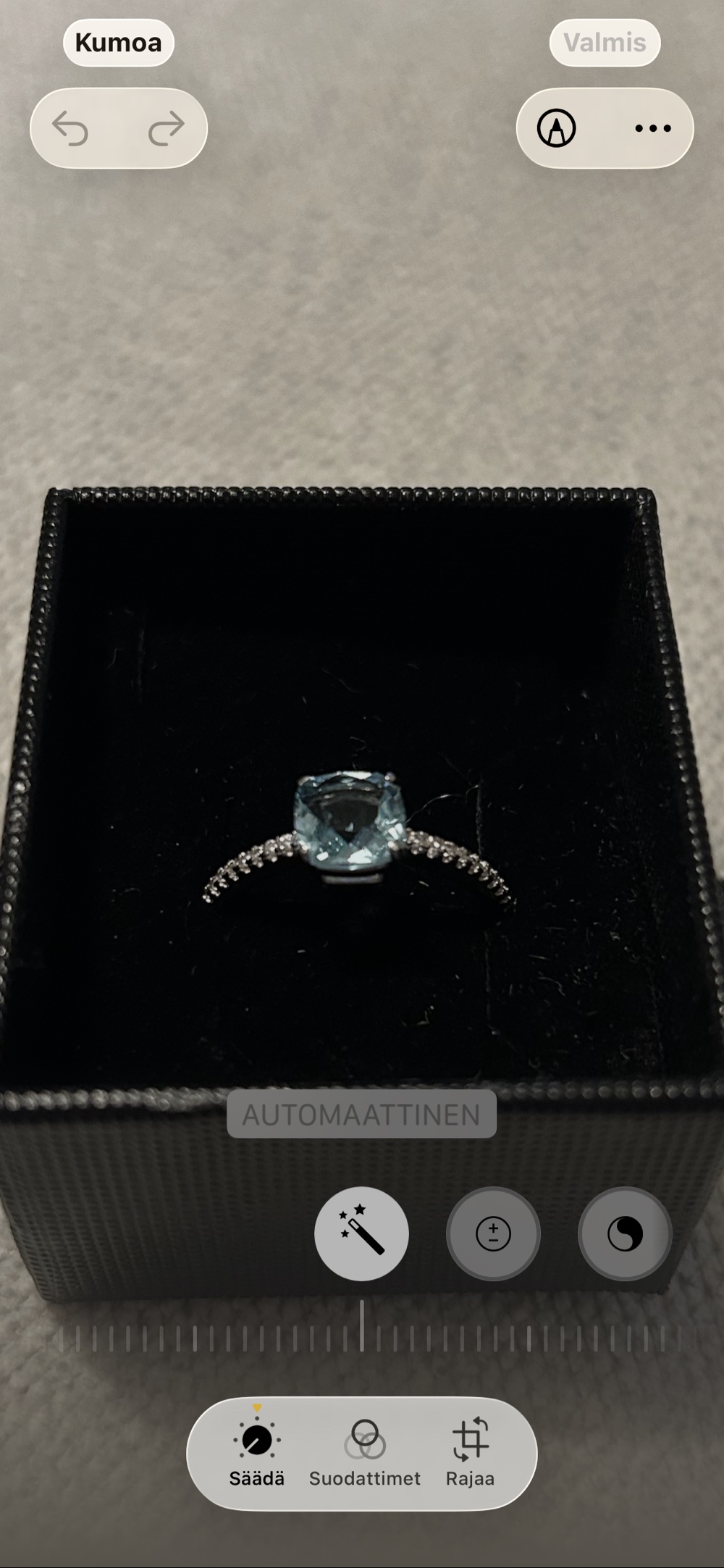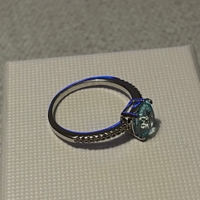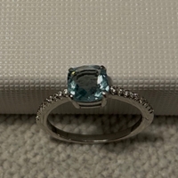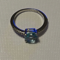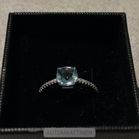 Keskellä vaaleansininen zirkoni-kivi, tämän molemmin puolin useita pienempiä kirkkaita zirkoni-kiviä.