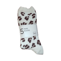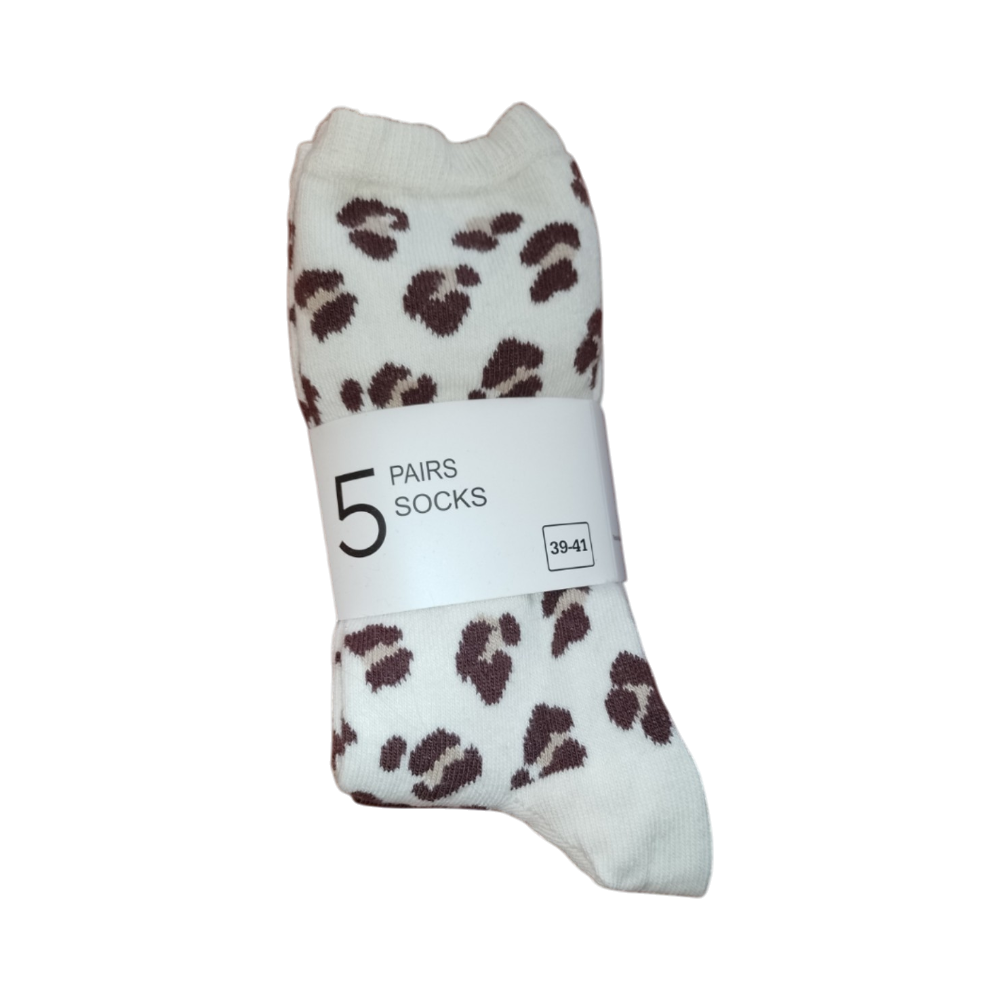 Viisi paria beige/brown -kuvioituja nilkkasukkia.