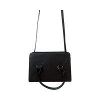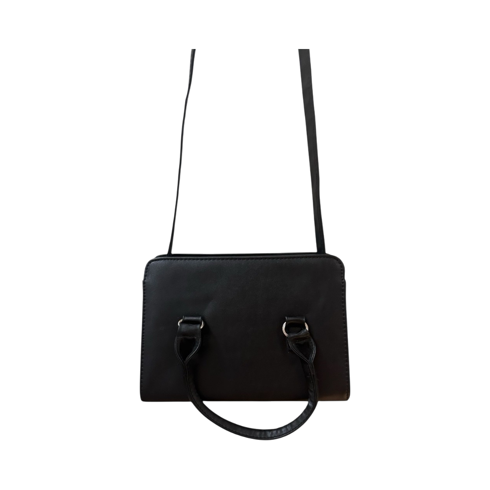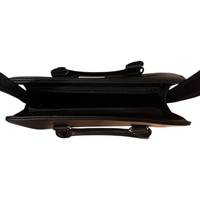 Classic black handbag with top handles and long strap, interior zip compartment.