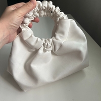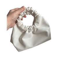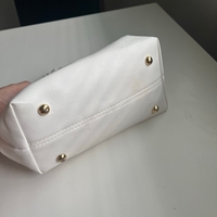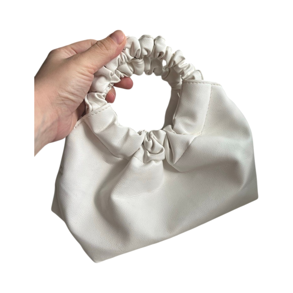 Pieni valkoinen olkalaukku, rypytetyt kahvat, messinkijalustat.
