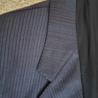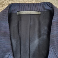 Luxurious fabric: 60% virgin wool / 40% silk — smooth, lightweight, with subtle multicolor pinstripes.