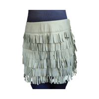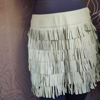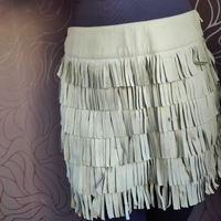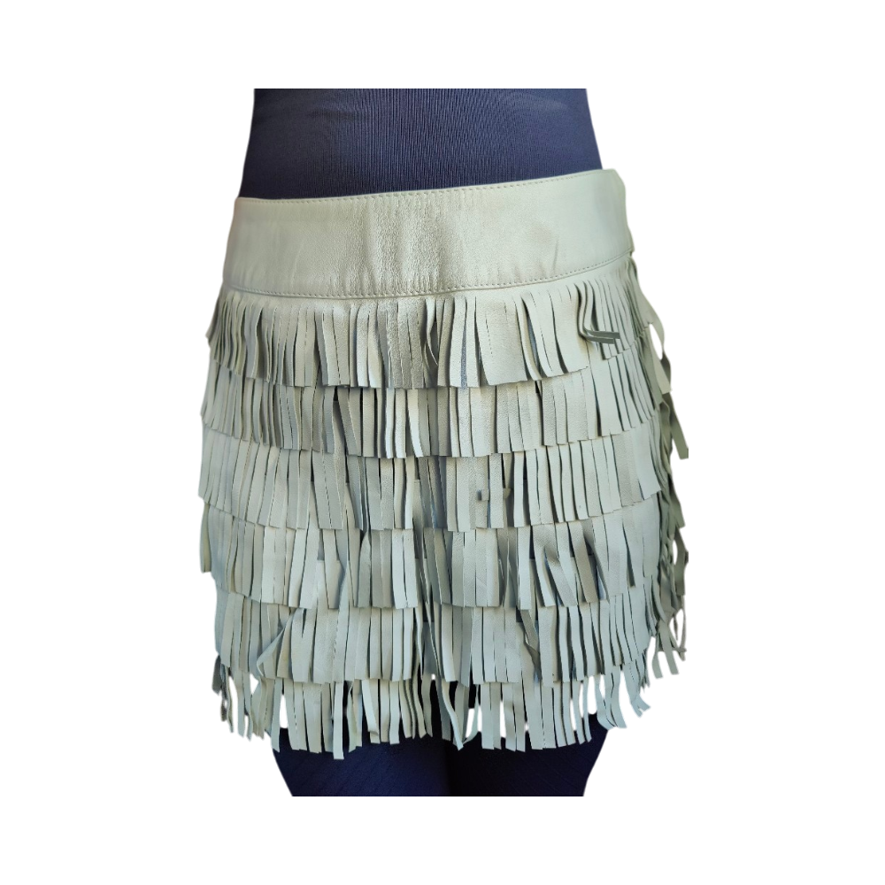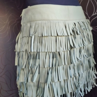 Valkoinen lyhyt nahkahame hapsuilla. Vetoketju sivussa. Hame asettuu lantiolle. Pituus noin 33 cm, vyötärön ympärys noin 76 cm.