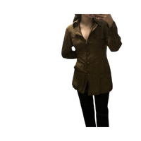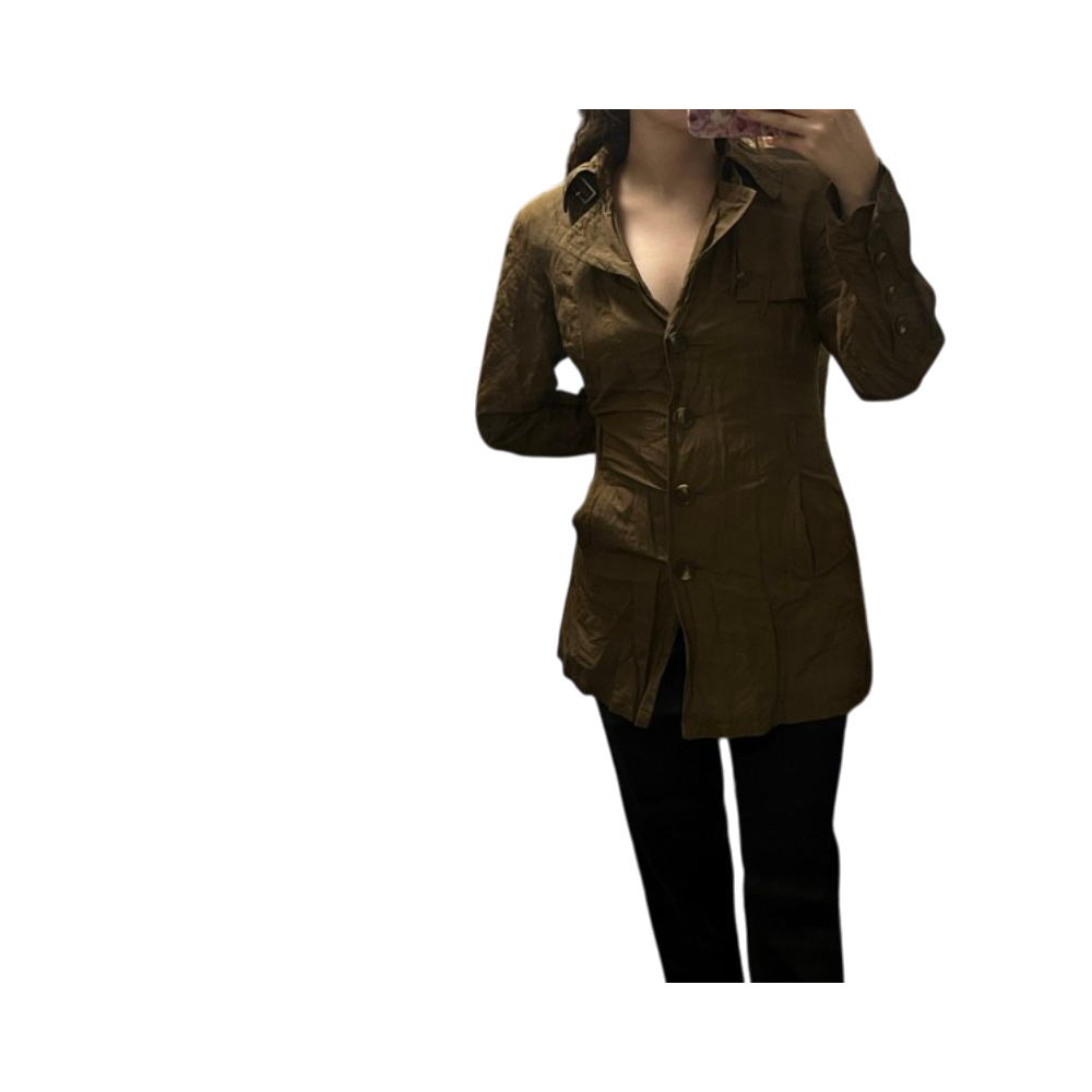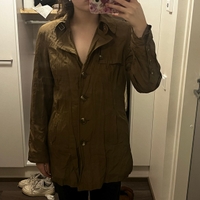 Kevyt, nappikiinnitteinen naisten takki, siisti mutta rypistynyt.