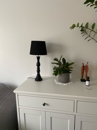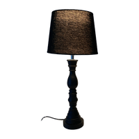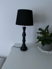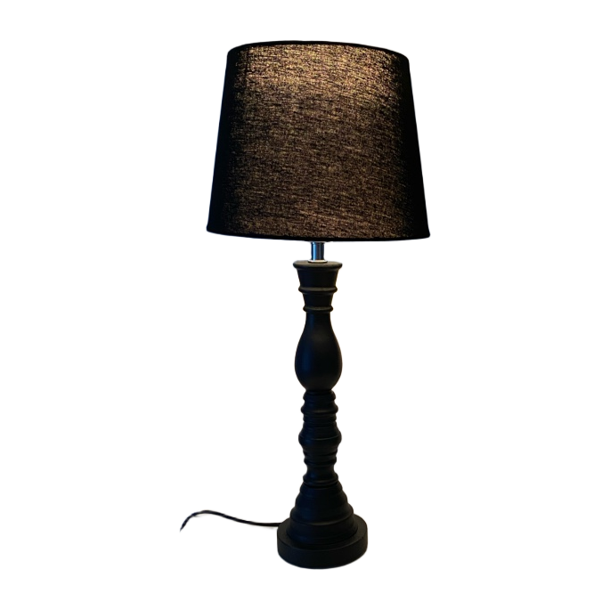 Mustassa pöytävalaisimessa on petsattu puinen jalka ja rustiikkinen pellavalampunvarjostin - täydellinen yhdistelmä luomaan upeaa vintage-fiilistä!