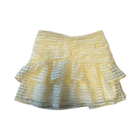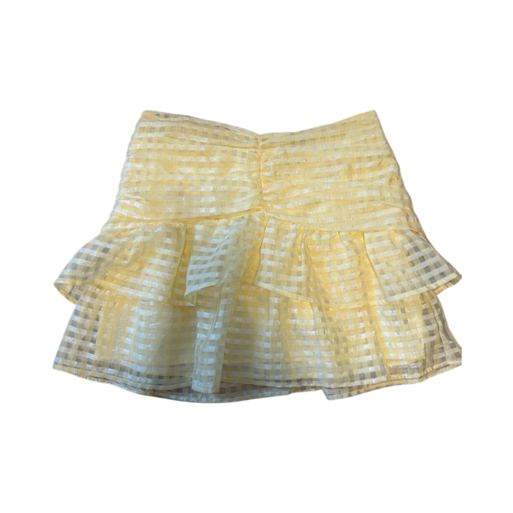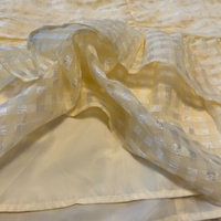 Keltainen kerroshame, ruudullinen läpikuultava pinta. Alla vaaleankeltainen alushame.