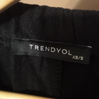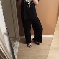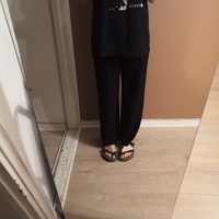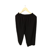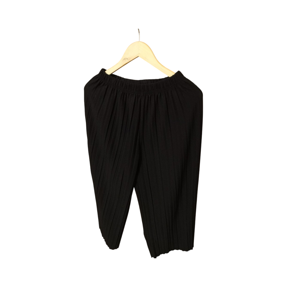 Leveät, pliseeratut mustat housut, joustava vyötärö, koko XS/S mutta vastaa enemmänkin M/L