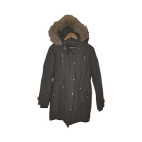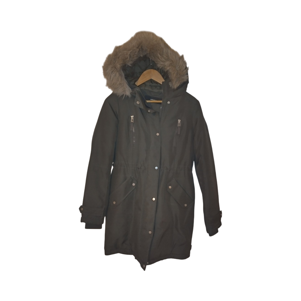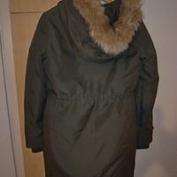 Vihreä pitkä parka, tekoturkisreunuksella hupussa.