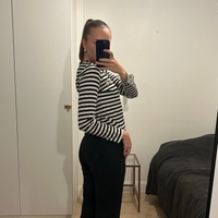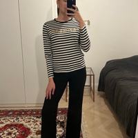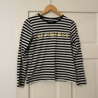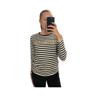 Black and white striped long-sleeve tee with gold Marimekko logo print. Size S. 100% cotton.