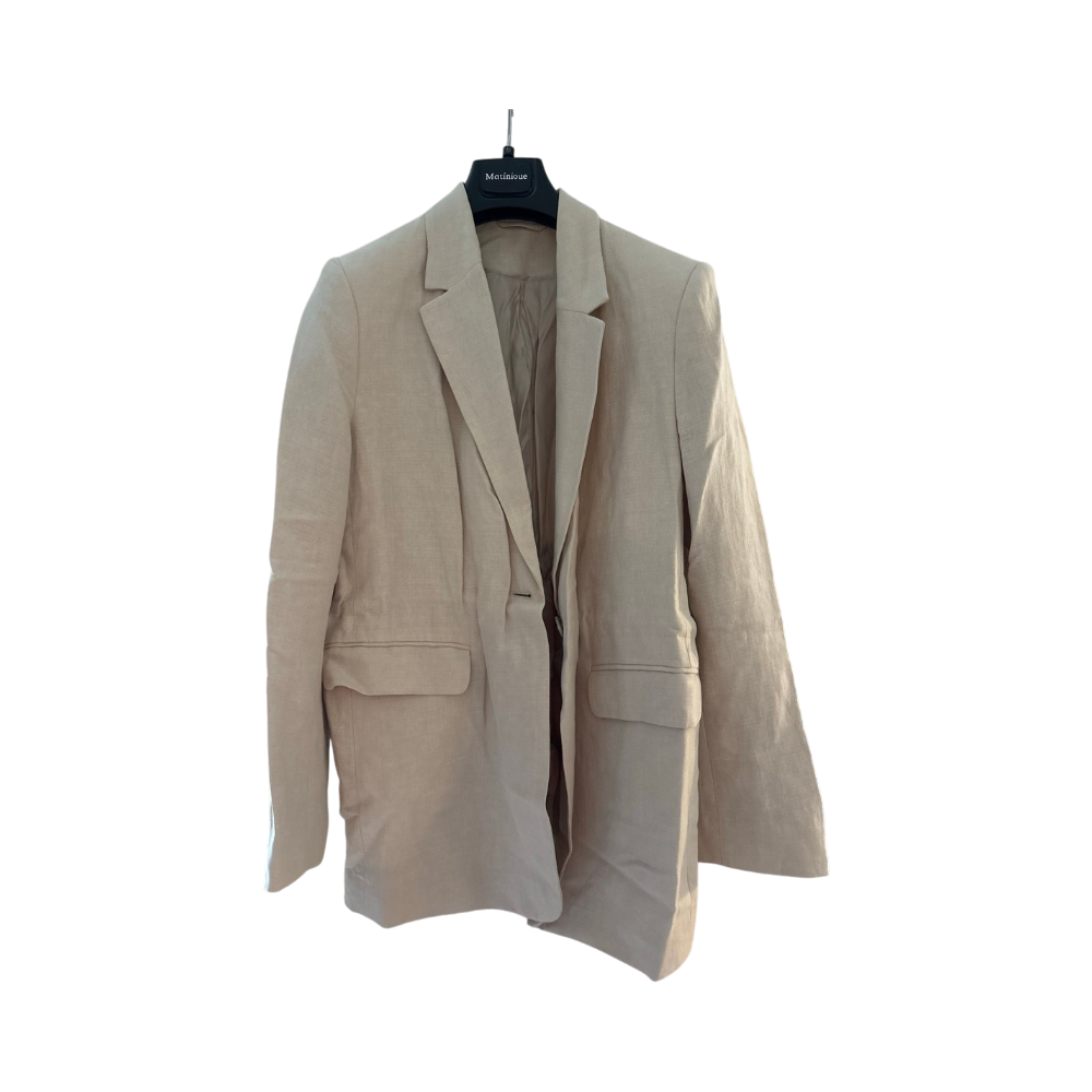 Beige pitkä pellavablazer, siistit malli ja taskut.