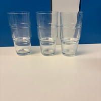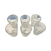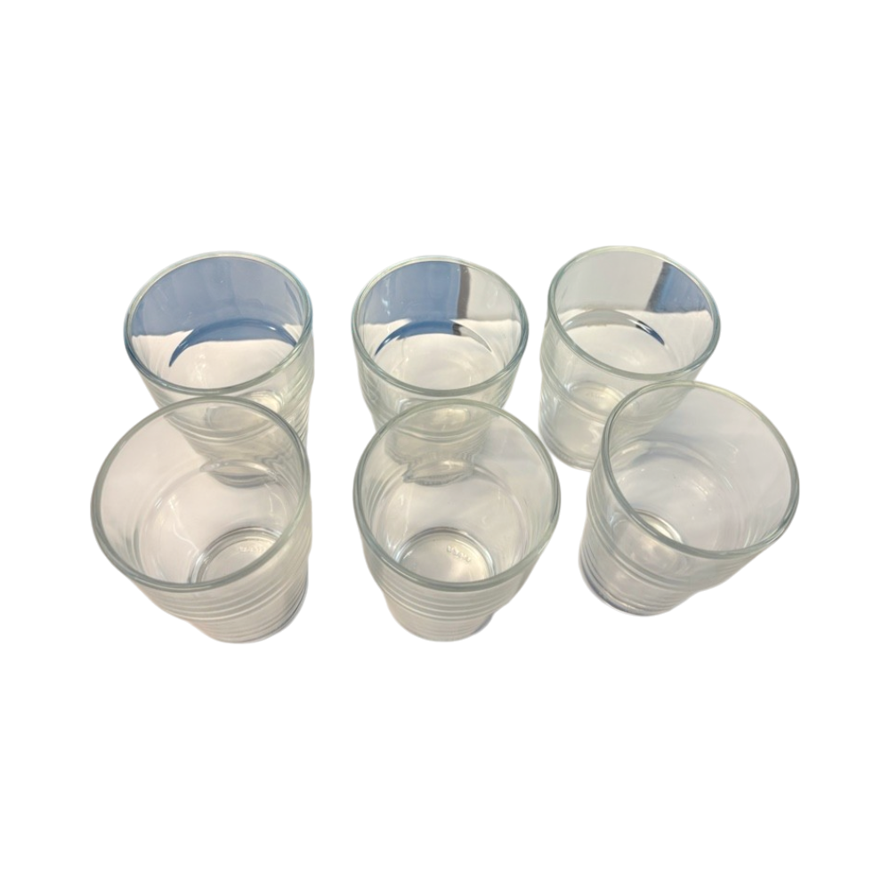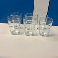 Kuusi kirkasta pientä juomalasia, pinottavat ja kestävät.