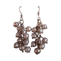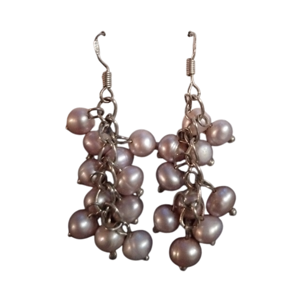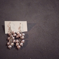 Roikkuvat helmikorvakorut, hopeanvärinen ketju, vaaleanpunaiset helmet.